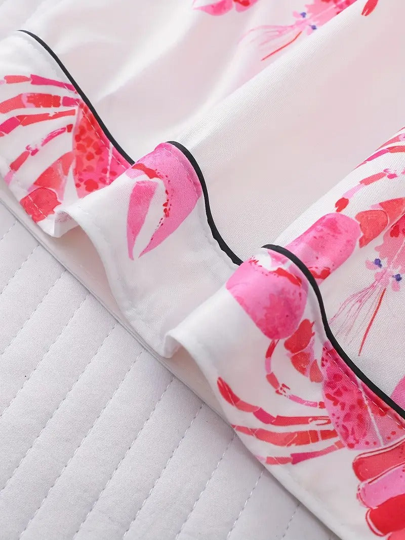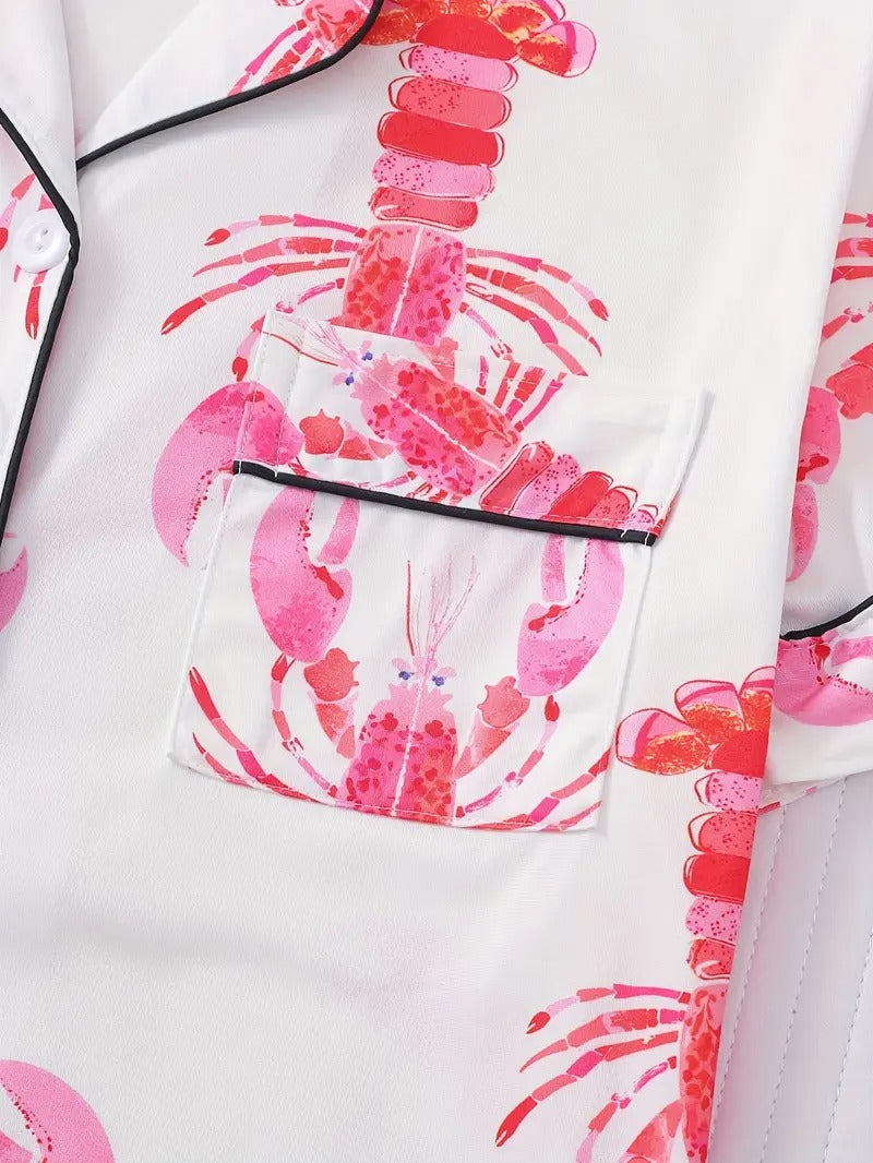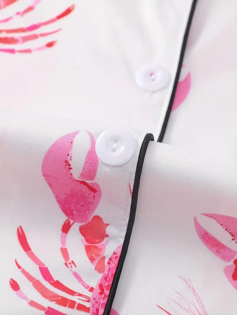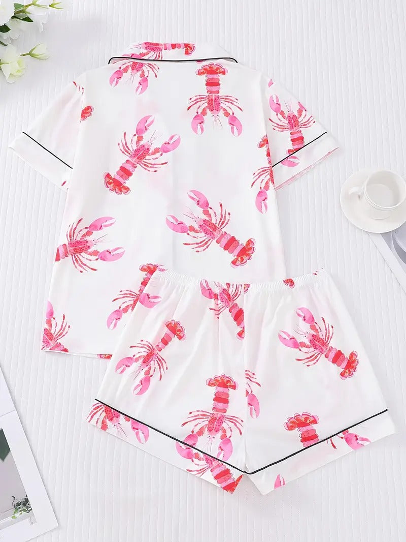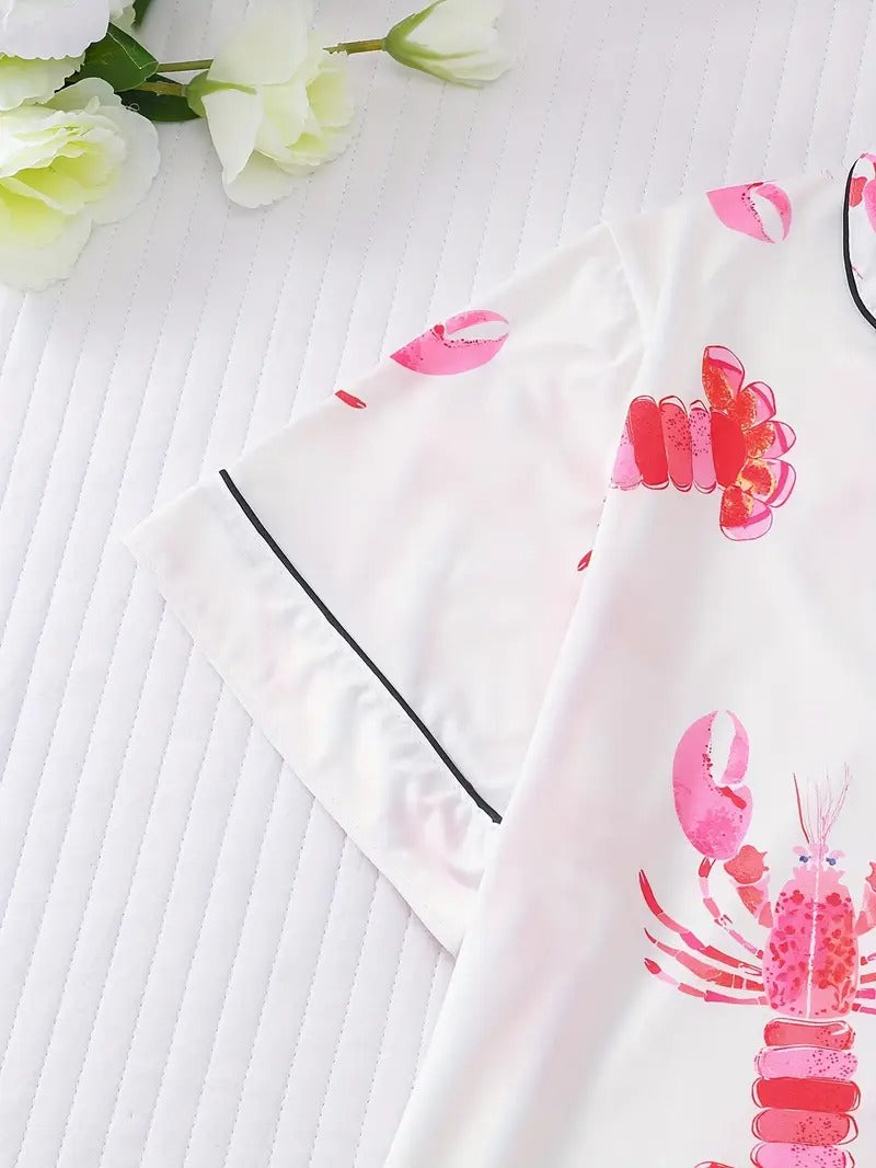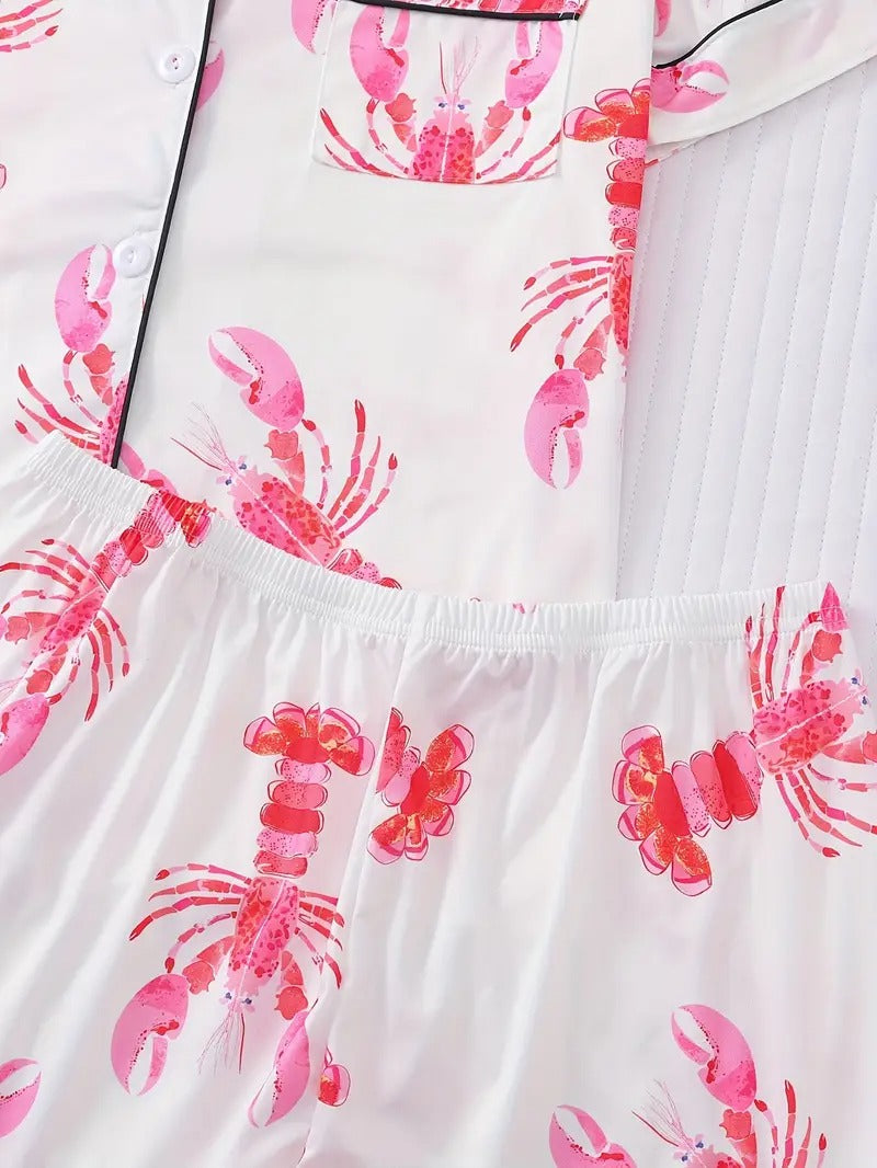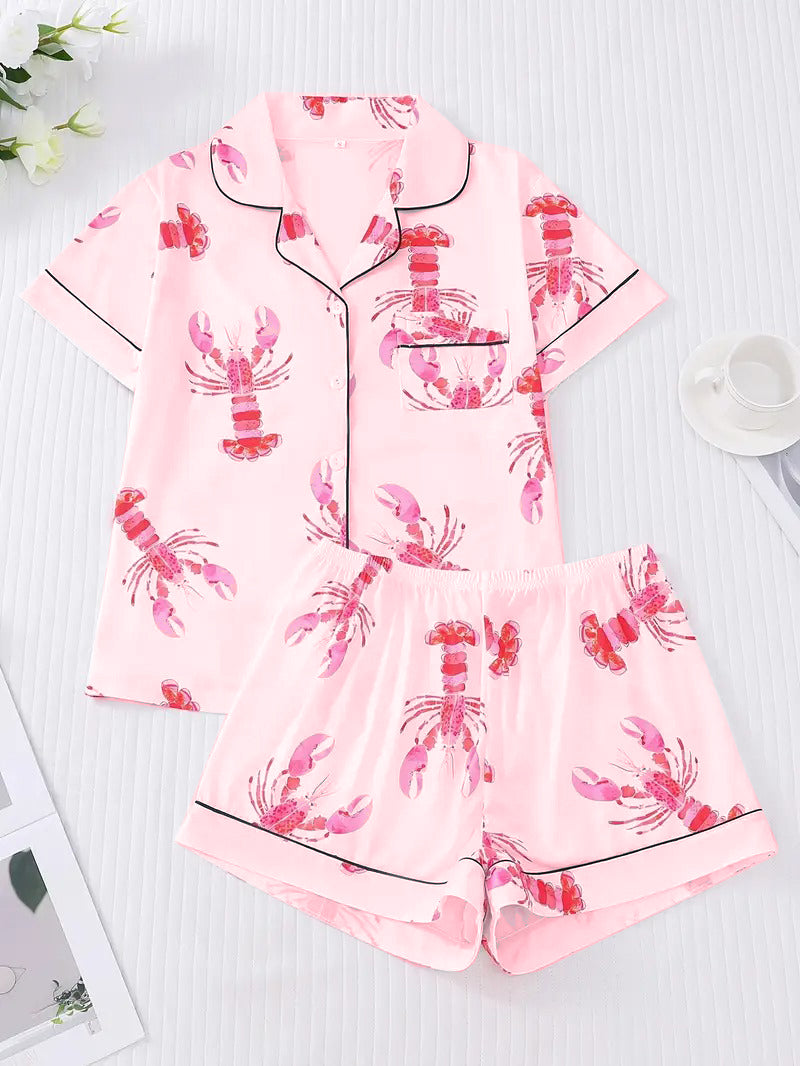 Women's Pink Lobster Print Pajamas Button-Up Short Sleeve and Shorts Homewear(BUY 2 FREE SHIPPING)